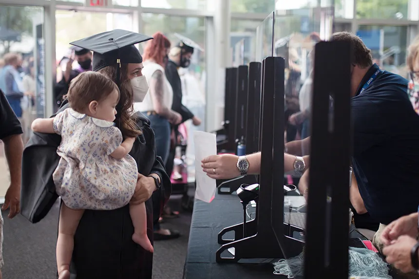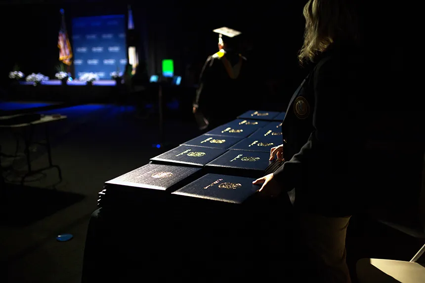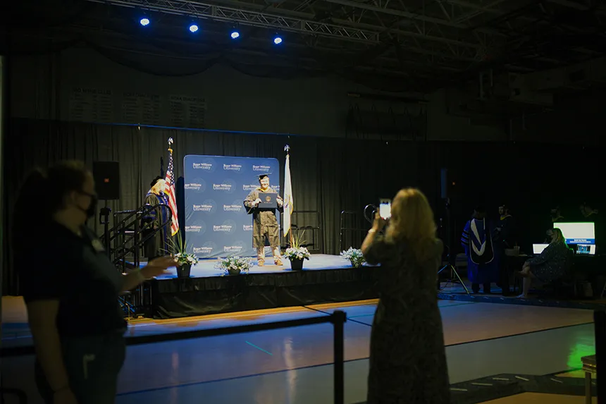 The entire graduating Class of 2021 totaled 1,227, including undergraduate students, graduate students, and students graduating with bachelor and associate degrees and certificates from University College at RWU’s Providence campus. Graduates participated in an in-person Grad Walk, processing in socially distanced groups with two guests each to receive their diplomas.