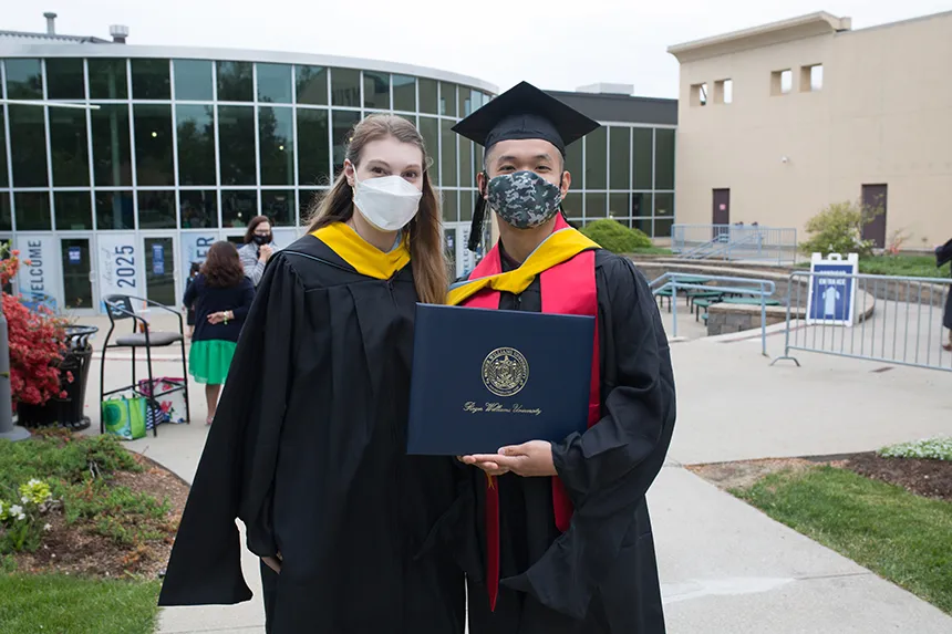 “The world needs you to think beyond yourself. A Roger Williams education is a call to do this. We need you to think about the impact of your actions on others, the impacts of a business decision on the environment, the impact of a policy on marginalized individuals,” he said. “Each choice carries significant responsibility, but you can handle it. Asking anything less of you is to diminish the importance of the roles you will play. Graduates of the Roger Williams University Class of 2021, now is your time to go forth into the world with confidence and resolve and make your mark on the world.”