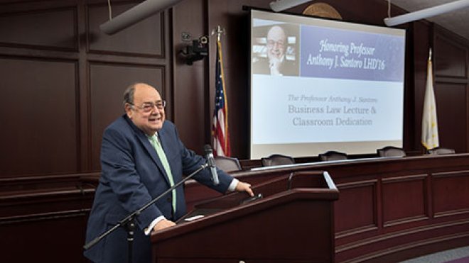 Following his tenure as law dean and as university president, he returned to RWU Law as a member of the faculty, teaching until his retirement in 2018. During those 18 years, he was an engaged, beloved faculty member. Many of his students followed in his footsteps to earn LL.M. degrees in taxation, and a number of them funded the Professor Anthony J. Santoro Business Law Lecture in 2012, bringing renowned academics and practicing lawyers to engage with students interested in business law. In 2018, the law school dedicated in his name the same classroom in which he taught hundreds of students federal income tax and business organizations.