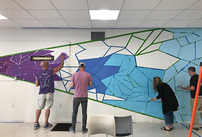 The creative suite the graphic design class delivered included a logo and designs for signs, murals, letterheads and business cards. Staff from the youth center recently installed the murals and graphics on doors, windows and walls.