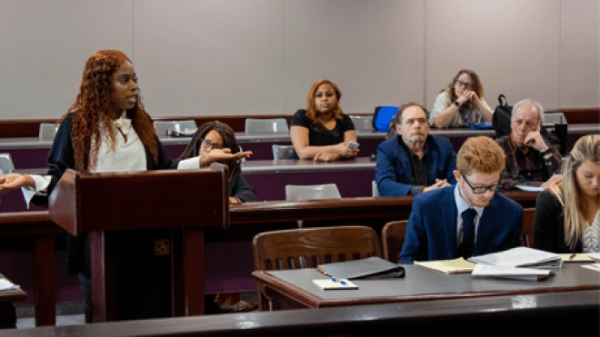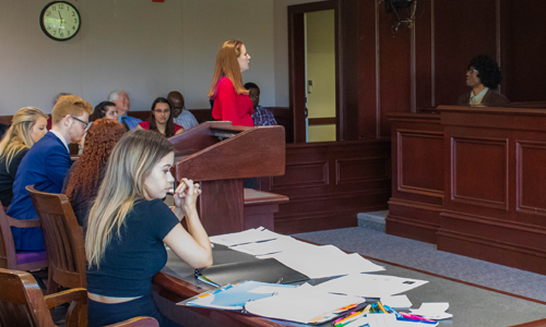 As an English literature major and attorney, assistant professor of legal studies Eve Brown aimed to combine her two passions while giving students real, hands-on experience with legal techniques such as direct questioning, closing arguments and cross-examining witnesses through a mock trial.