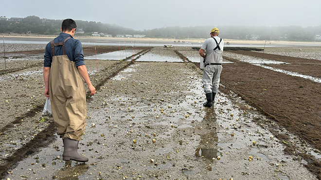 RWU's Michael Torselli and Josh Reitsma from Cape Cod Cooperative Extension conduct yearly sampling of quahog plots.