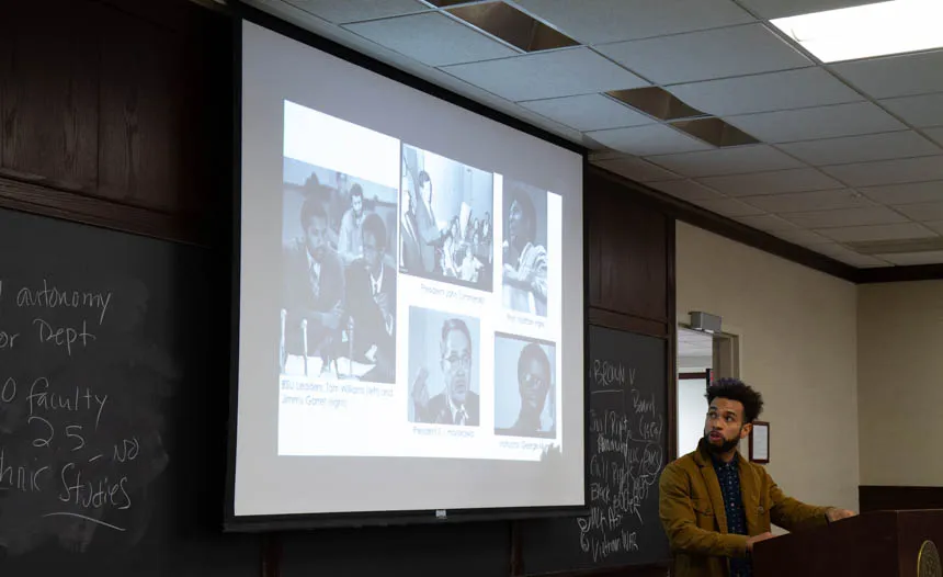 Assistant Professor of American Studies Aaron Allen will discuss another contentious, unprecedented protest. His presentation, “Our Survival is Non-Negotiable’: Student Dissent and the San Francisco College Strike,” will explore the longest student-led protest in U.S history, in which 1968 San Francisco State students demanded racial representation on campus. Allen cites San Francisco State as one of the biggest contributors to the field of Ethnic Studies being offered at campuses nationwide.