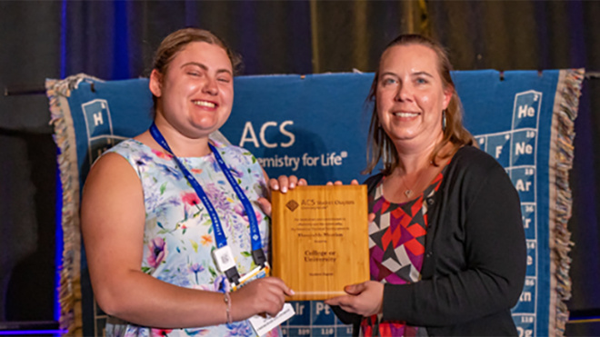 Several students also earned recognition for the quality of their research. Seniors Grace DiBlasio, a Chemistry major and Music minor from North Andover, Mass., and Gabriella Fabrizi, a Biology and Chemistry double major with a Political Science minor from Fairfield, Conn., were invited to present their research posters at the meeting. They were joined by seniors Jamie Wells, a Biochemistry major and Mathematics minor from Castle Rock, Colo., and Meisi Gaudreau, an Environmental Science and Political Science double major from Danville, N.H., whose research was selected for Sci-Mix, a prestigious showcase displaying the strongest research and presentation skills in each division.