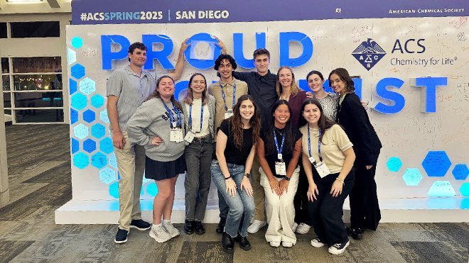 Beyond research, the student-run Science Alliance club was prominently featured at the meeting. Junior Abby Heroux, a Chemistry and Secondary Education double major from Warren, R.I., accepted an award on behalf of the group, recognizing its work in science education and outreach. Senior Preston Sharrock, a Chemistry and Mathematics double major with a minor in Psychology from Branchville, N.J., presented a poster on the alliance’s initiatives, demonstrating the role of student-led efforts in expanding access to STEM education.