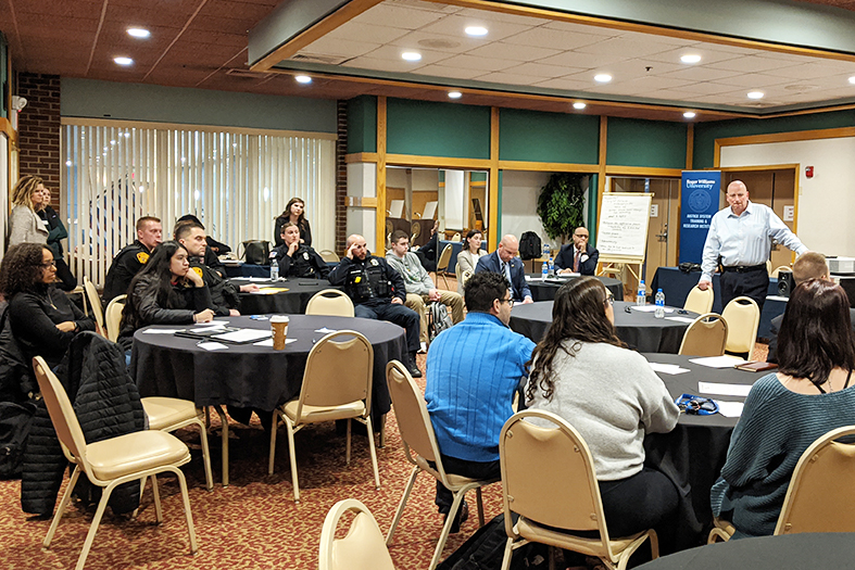 Students from RWU’s School of Justice Studies met with local police chiefs and officers to discuss their perspectives on current issues affecting the police force