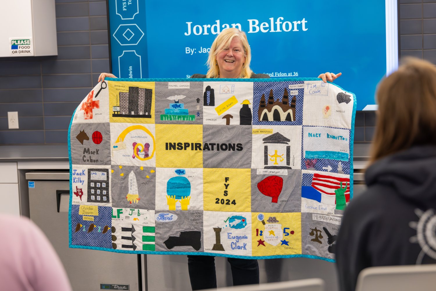 BRISTOL, R.I. – Inside the School of Engineering, Computing, and Construction Management building, a vibrant quilt greets visitors, each square depicting the lives of Harrison Ford, Eugenie Clark, and other influential figures. These personal designs are the result of 15 weeks of in-depth research by first-year students in Professor of Engineering Janet Baldwin’s Hidden Stories Told by Quilts course. Through this collaborative project, students explored how to creatively tell someone’s story through visuals, resulting in a 5-by-3-foot tapestry of inspiration.