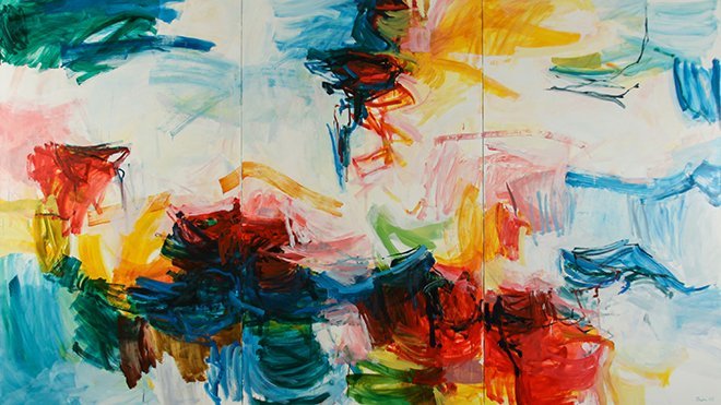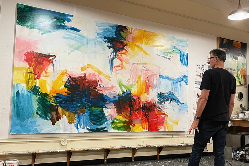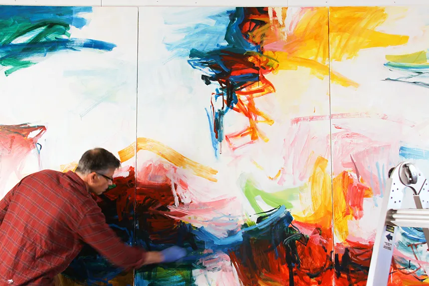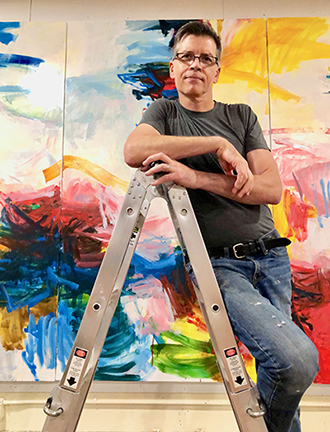 At 7-feet by 12-feet and in three panels, “La Serenata” is a colorful large-scale abstract painting inspired by the waters of Venice, or more specifically, the water as it appears in the 19th-century paintings of Claude Monet, John Singer Sargent and JMW Turner, Rich said. His piece “aims to give the viewer a moment of respite and old-world romanticism amid the chaos of the current day.”