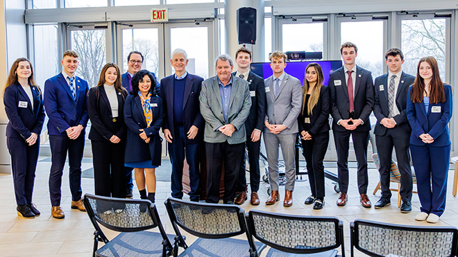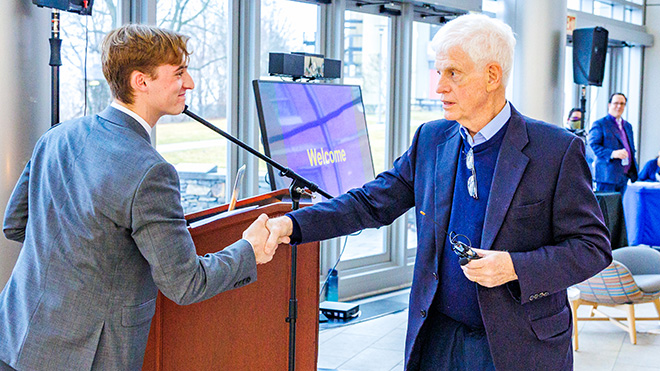 As Diya Das, Dean of the Gabelli School of Business, wrapped up the event, she called forth Sam Carter, a first-year student from Cumberland, Maine, double majoring in Finance and Business Management, who is the first recipient of the Gabelli School of Business Scholars Program. The scholarship, funded by Mario J. Gabelli, covers full tuition for four years and is awarded to a student based on their academic merit, passion for working in fields of business, and leadership potential.