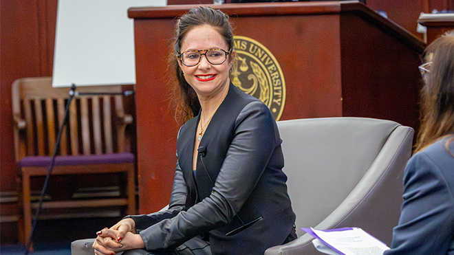 Goldberg joined Law Professor Emily J. Sack for a discussion exploring her career representing survivors of sexual violence and individuals harmed by online abuse and harassment. The annual program is part of the Women in Law Leadership Lecture Series, which brings influential women in the legal field to campus.