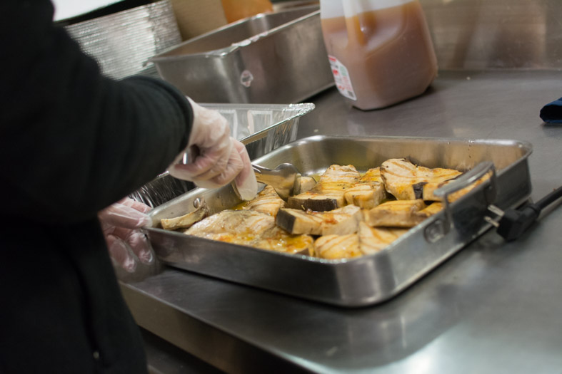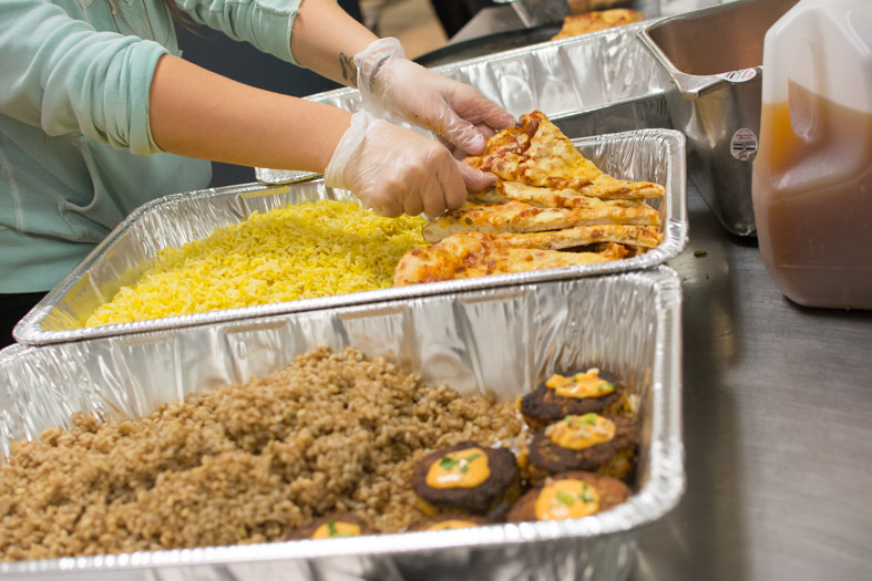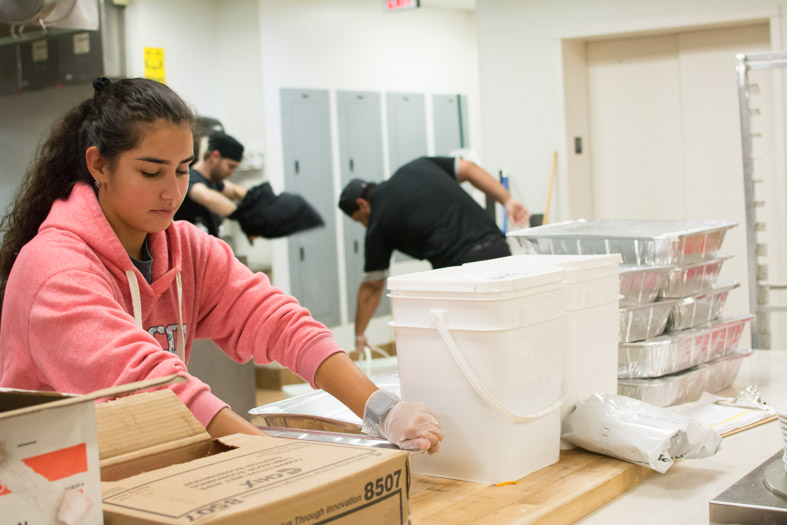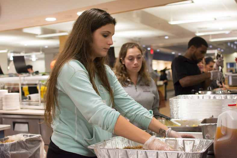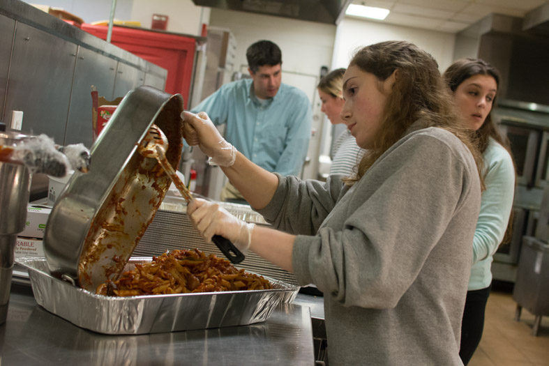 They formed an assembly line. And while the kitchen staff buzzed around them, breaking down and cleaning for the night, they divided the main tasks that go into collecting the food for recovery. Sarno along with sophomore Stephanie Dunia packaged the food into the tin containers. McGrath helped with the packaging and weighed all the food. She then brought it to another student, Katherine Castro, a junior forensic science major, who was covering and labeling all the food. Soon enough the containers started piling up.