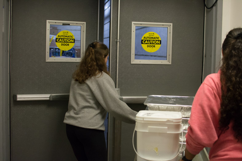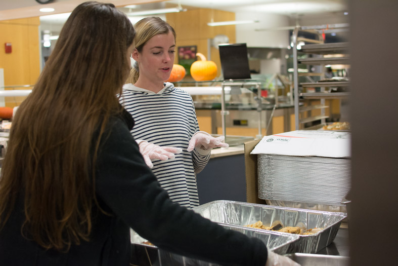 Joining McGrath tonight was her roommate, Emma Sarno, a senior marketing major. This was her first food recovery night. “Lead the way,” she told McGrath as the group got started. Usually it takes about 30 to 40 minutes for the whole process.