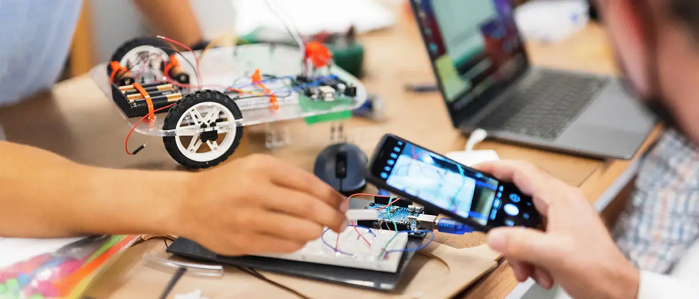 Students work on robotics projects at lab tables, with tools, wires, and parts spread out in a bright, modern classroom.