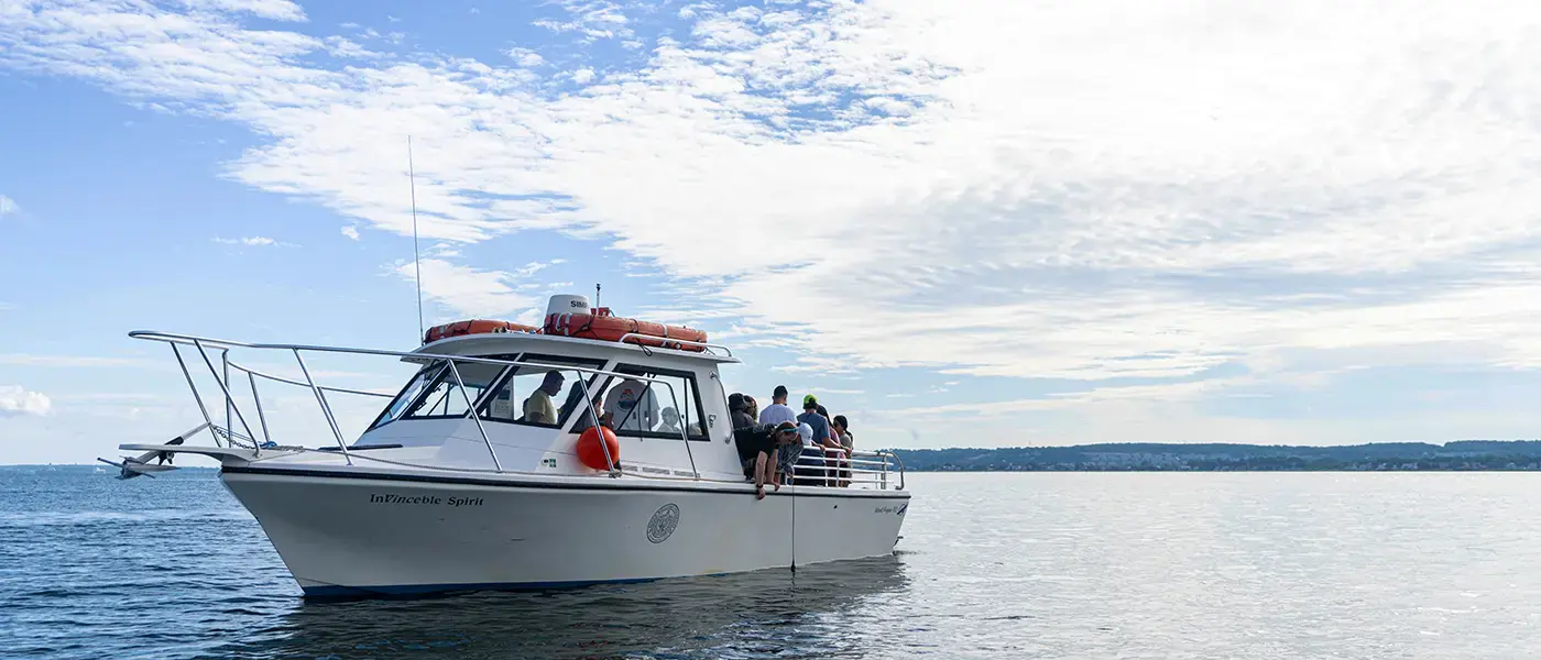 As part of a unique hands-on experience, an entire class can be taken on board RWU's experiential learning research vessel, the InVinceable Spirit, a 30-foot craft that's outfitted with cutting-edge coastal research equipment.