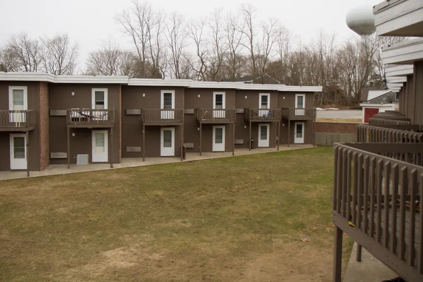 The Flats contain 4 one-bedroom apartments per cluster (for a total of 19 apartments), housing two residents each and equipped with full carpeting and furniture, a living room and kitchen with a full-sized electric stove/oven, refrigerator, dining area and a bathroom. Laundry facility on the first floor of the first cluster.