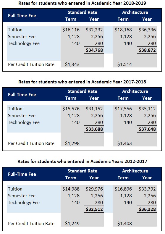 Please note: These are estimated charges based on standard tuition & fees for full-time students 12-19 credits in a Graduate Architecture program. Students above 19 credits will be charged additional per credit rates.