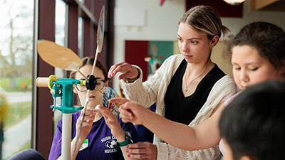 Engineering and Education majors team up for KidWind, instructing fourth graders on engineering and how to design and build their own model-scale wind turbines.